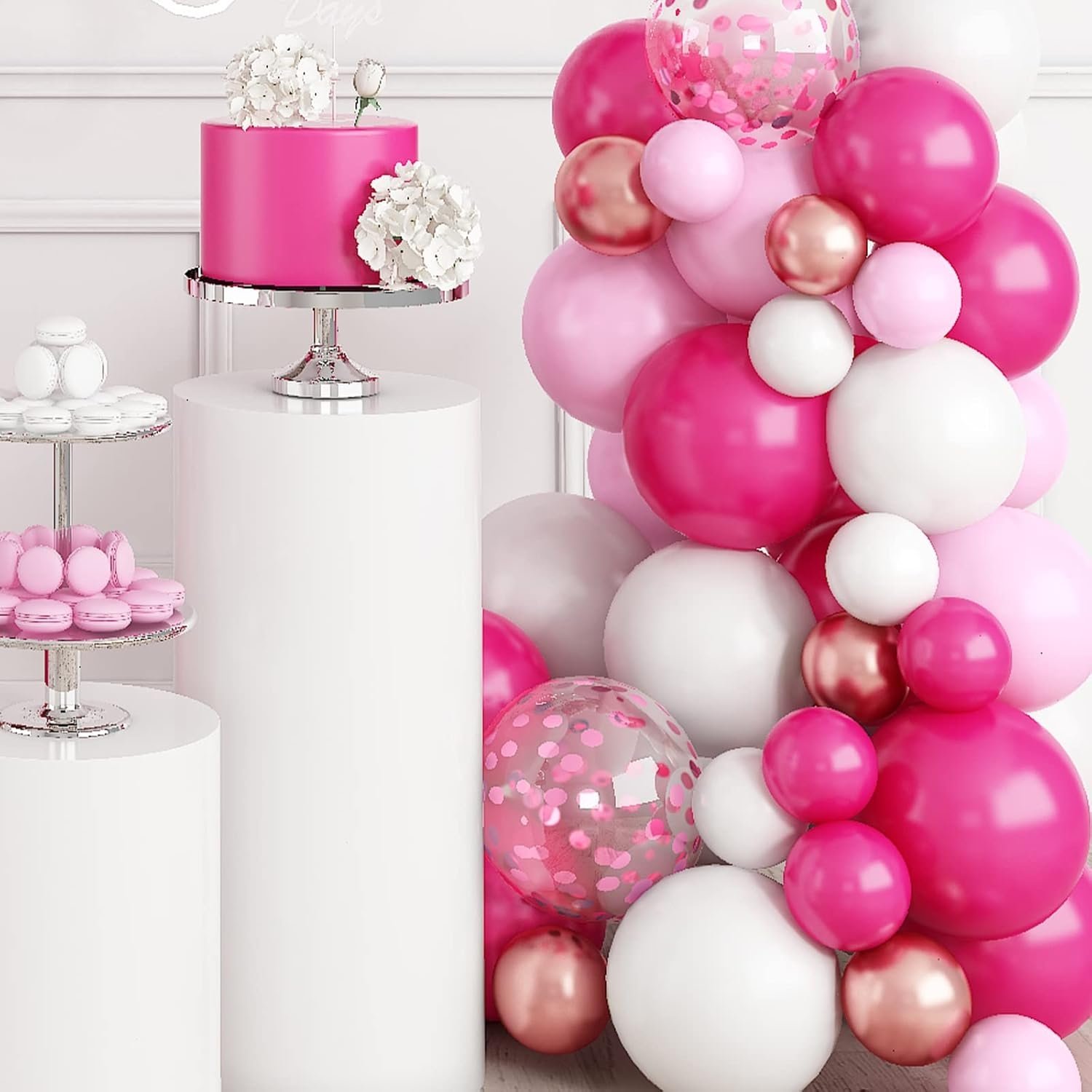 Bring your party to life with this all-in-one pink balloon arch kit featuring 110 premium latex balloons in a stunning mix of Rose Red,light pink, metallic pink, and confetti styles. Whether you’re celebrating a baby shower, girl’s birthday, bridal shower, wedding, or Valentine’s Day, this pink balloon garland adds an elegant and playful touch to any occasion.