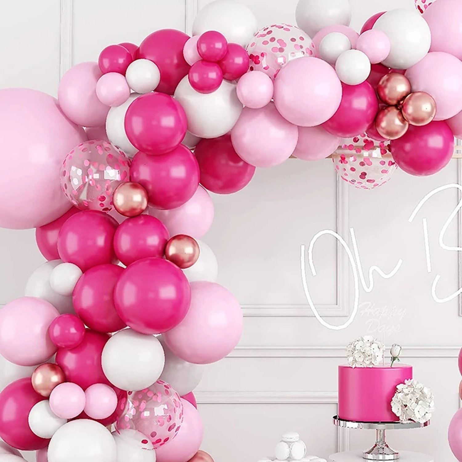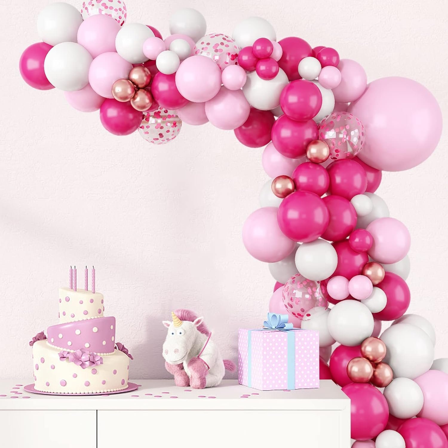 - Beautiful Pink Color Palette for Elegant DecorationFeaturing a dreamy combination of Rose red,light pink, metallic pink, and confetti balloons, this garland kit adds a romantic and playful vibe to your decorations. Whether you’re planning a princess-themed birthday, gender reveal, or Valentine’s Day setup, this soft and stylish color mix creates a stunning party backdrop every time.
