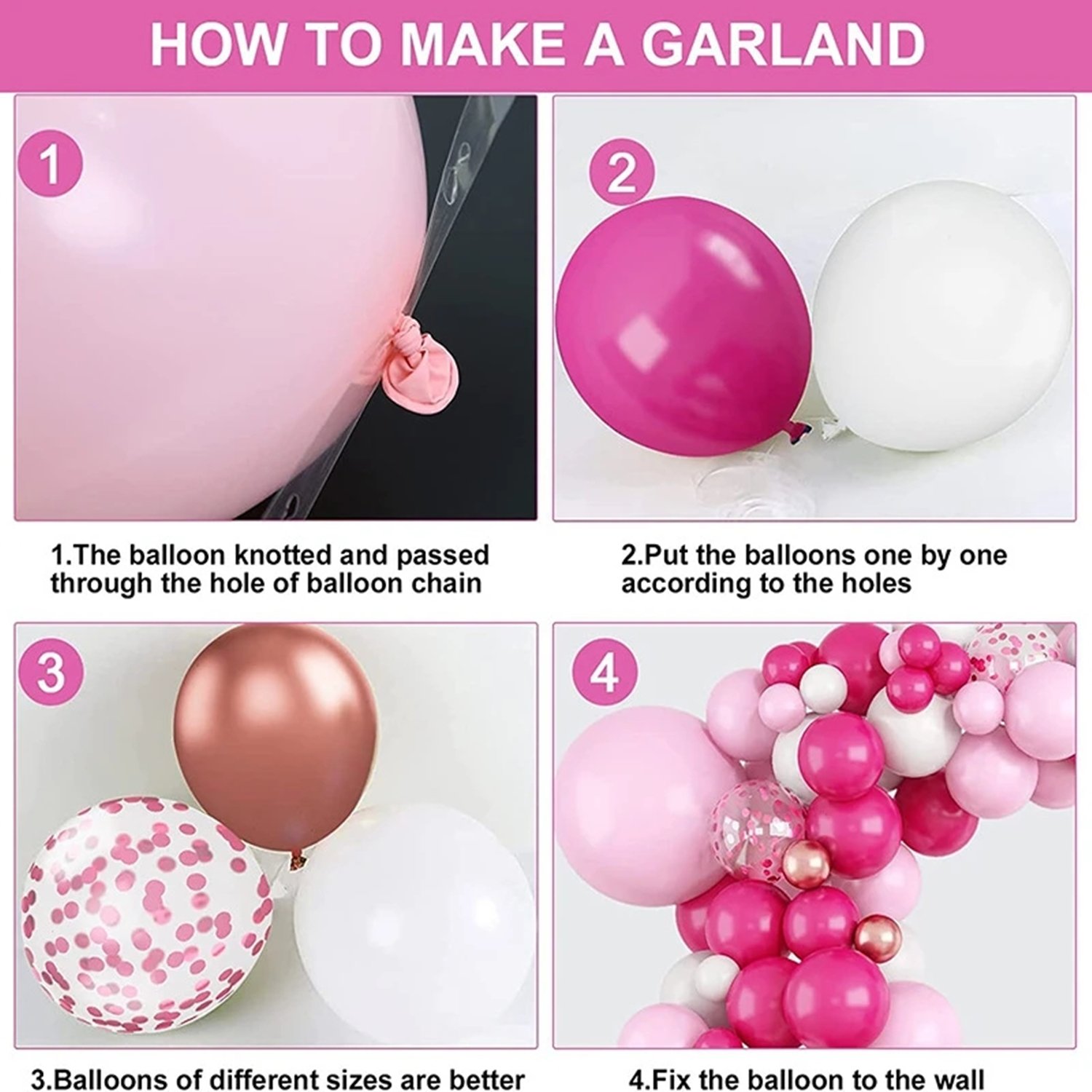 - All-in-One Pink Balloon Garland Kit 110 Pieces TotalThis complete pink balloon garland kit includes a mix of Rose Red, light pink,metallic pink, and confetti pink balloons in 5″–18″ sizes, plus 3 essential decorating tools: balloon strip, glue dots, ribbon—everything you need for a picture-perfect display.