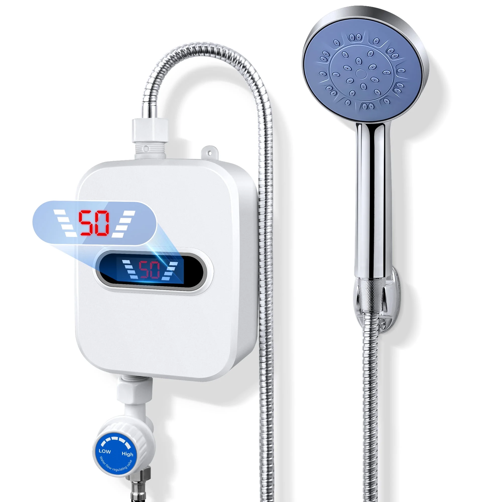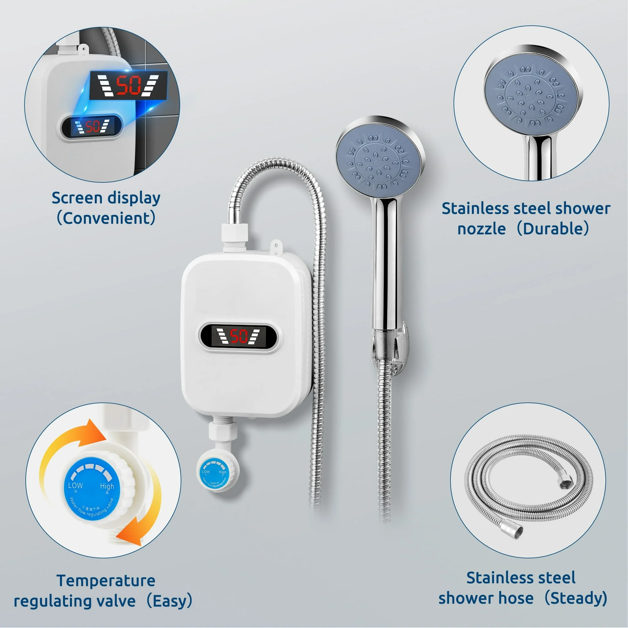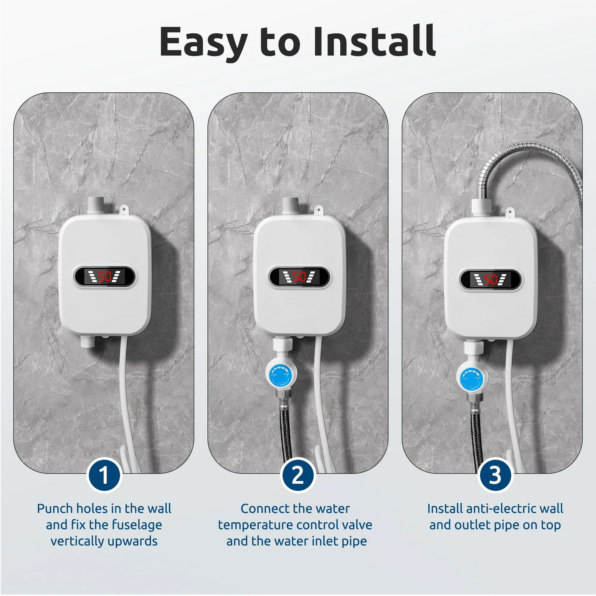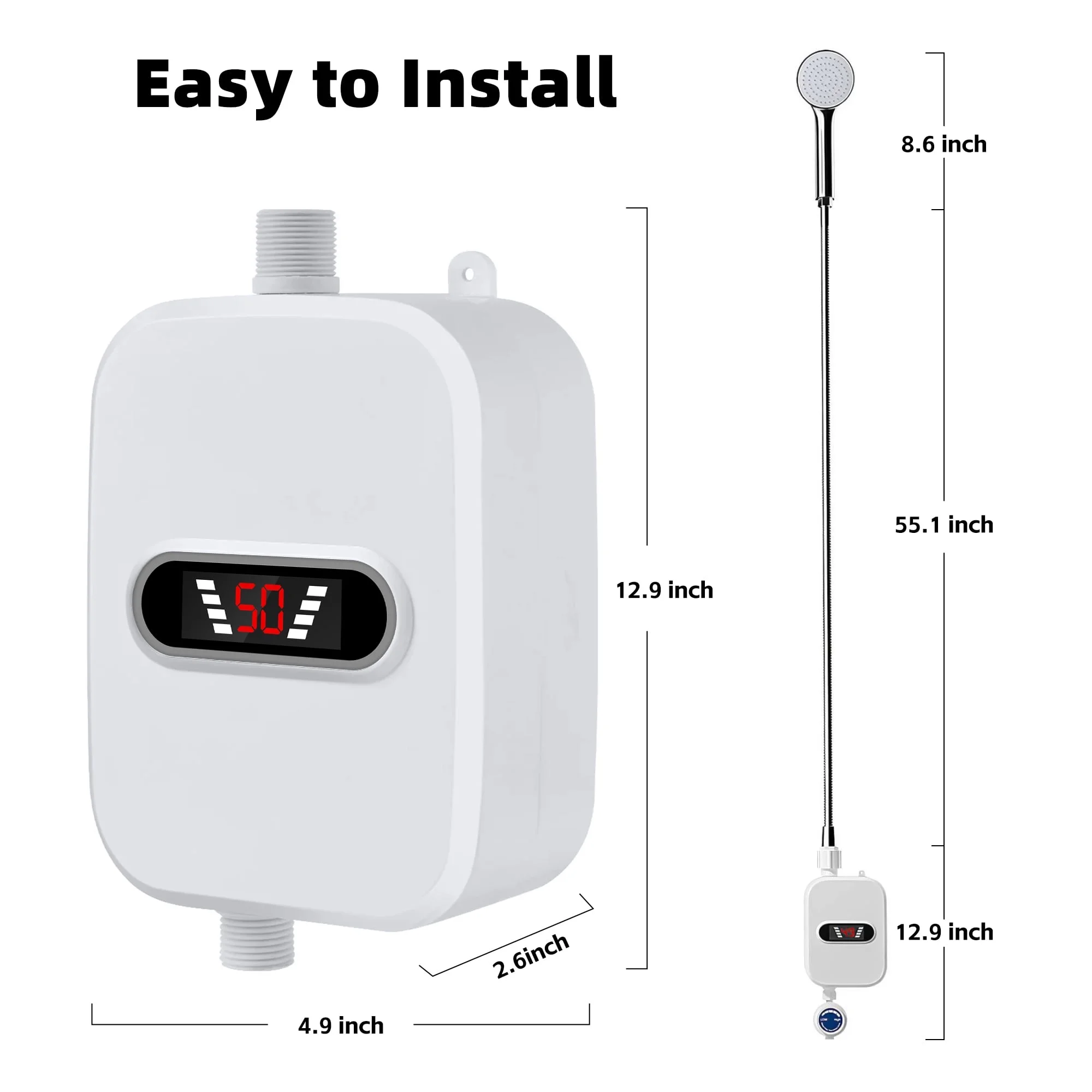 - Easy To Use Tankless electric water heater with easy-to-operate knob temperature adjustment design,easy to control warmth and the LED screen displays the temperature in real time.Pipes and other accessories are complete for quick installation without additional expenses or preparing time of accessories, saving you time and effort.