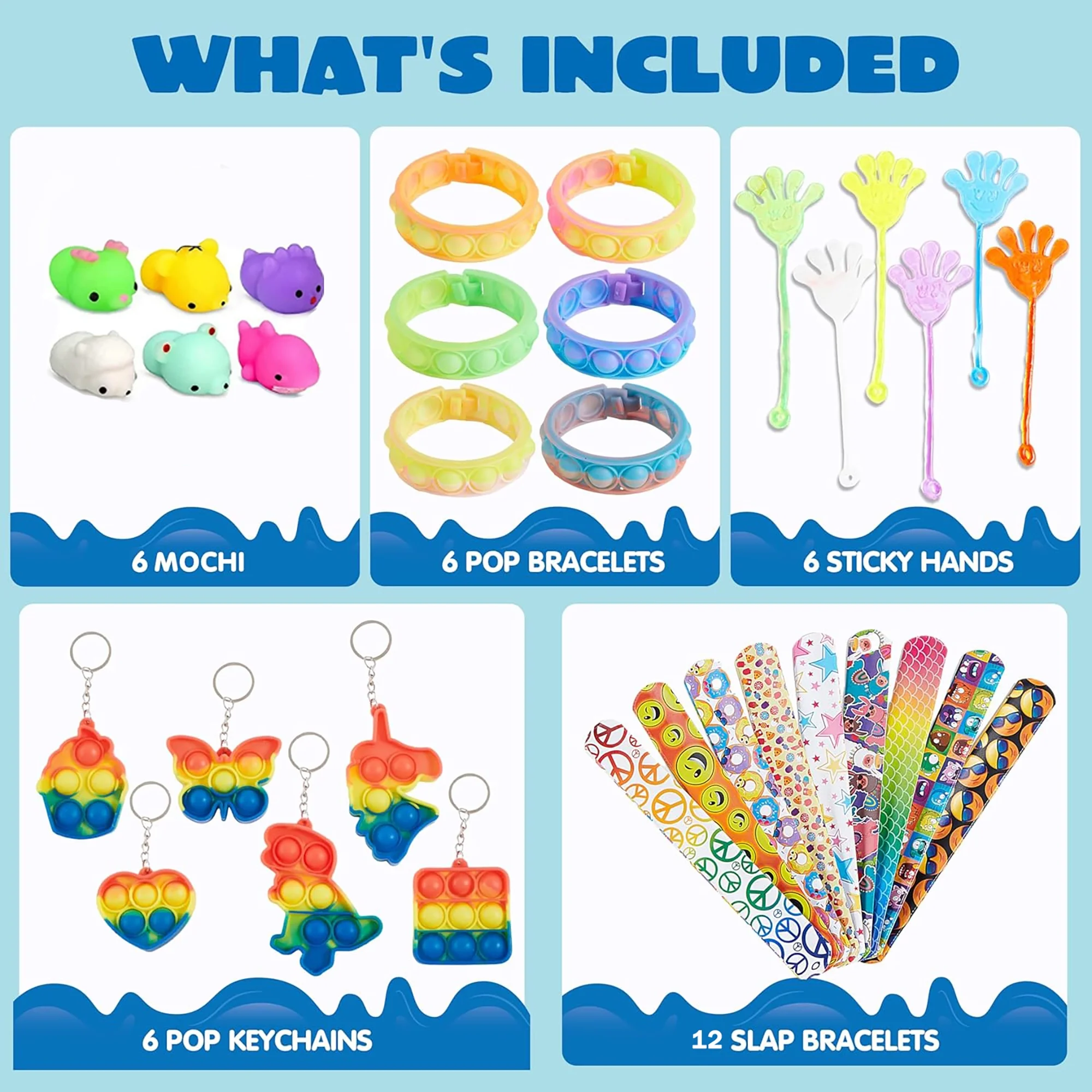 - 【All-in-One Unique Party Favors Set for Kid –72PCS】This mega-value party favor pack includes 72 pieces of trending fidget toys and fun items kids love! perfect for birthday parties, classroom rewards, treasure boxes, and goodie bags! it Includes:(Note: Colors are shipped at random.)6 Mochi Squishy Toys,12 Slap Bracelets,6 Pop Keychains,6 Pop Fidget Spinners,